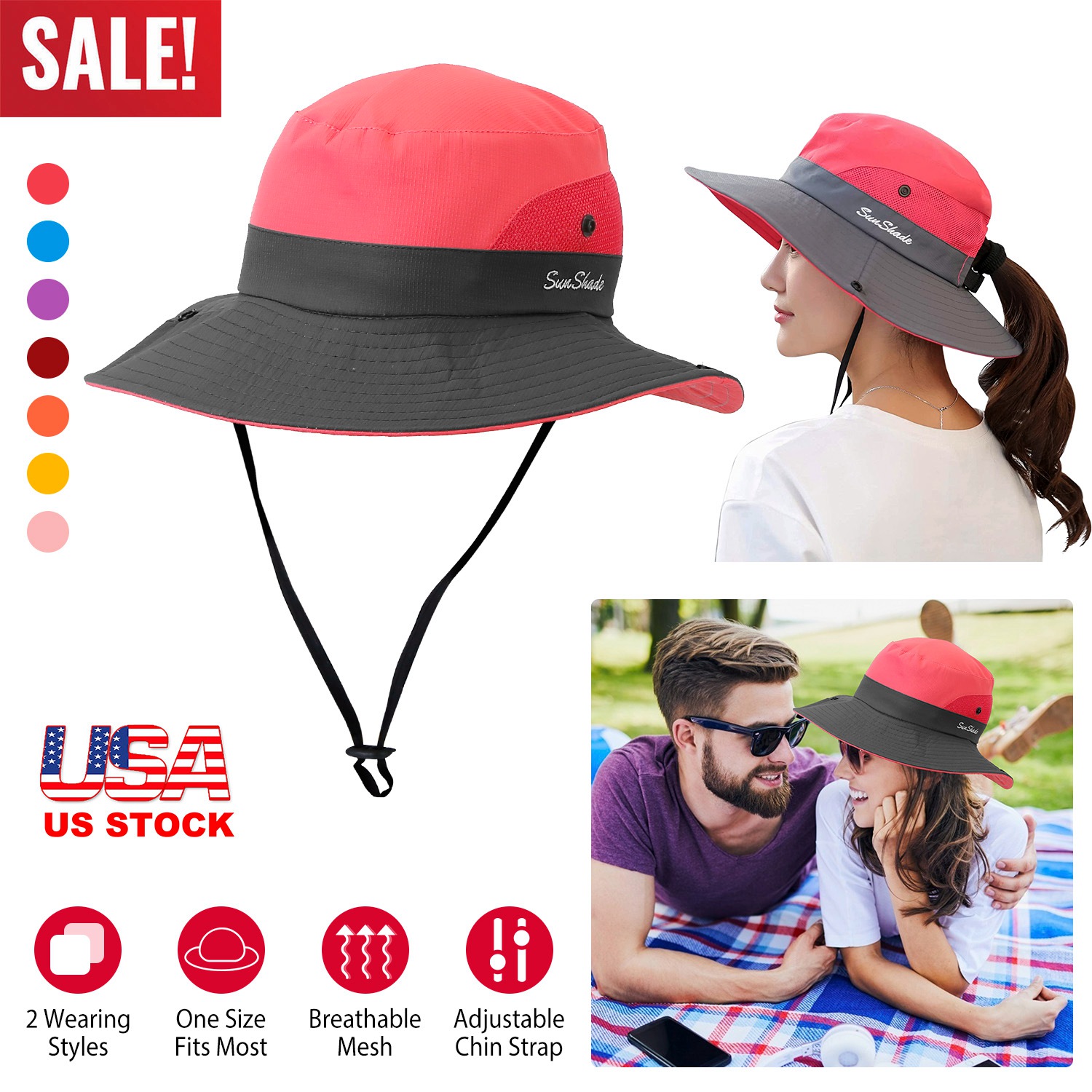 Our sun hat is lightweight and breathable to wear with mesh design. The ponytail hole in the perfect place allows you tie your hair easily. You can also snap the buckle on the hat side to enjoy unique wearing. Elastic buckle and adjustable chin strap make the hat fit your head well and not easy to fall. Large brim (3.15in) helps to cover your face, neck and your ears, thus protecting your skin from rays and possibly prevent age spots, keeping you cool during the whole summer!