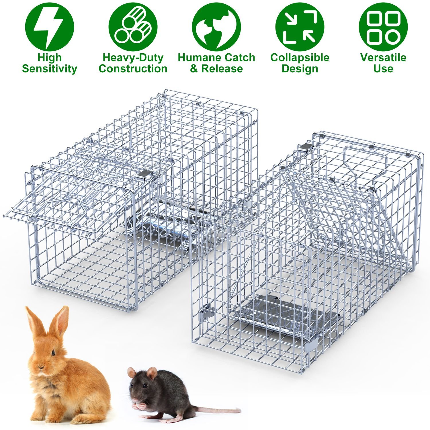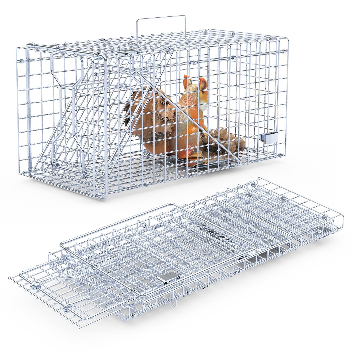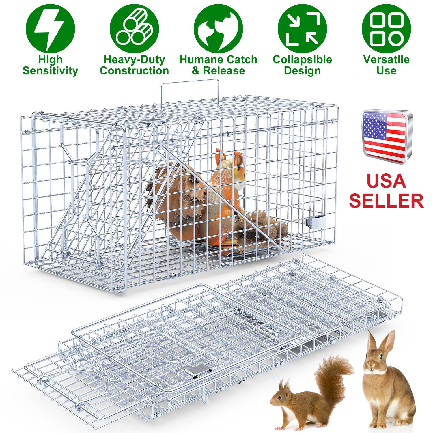 Humanely and safely capture small animals with this 18inch collapsible live animal trap cage. Designed for easy setup and portability, this heavy-duty iron trap features a single door mechanism for secure catches. Ideal for controlling small animals like squirrels, rats, weasels, juvenile raccoons, small feral cats, opossum, muskrats, small dogs, juvenile armadillos small rabbits and small foxes, it allows for catch-and-release without harm. Perfect for use in gardens, yards, and farms, this reusable trap is a humane solution for wildlife management.