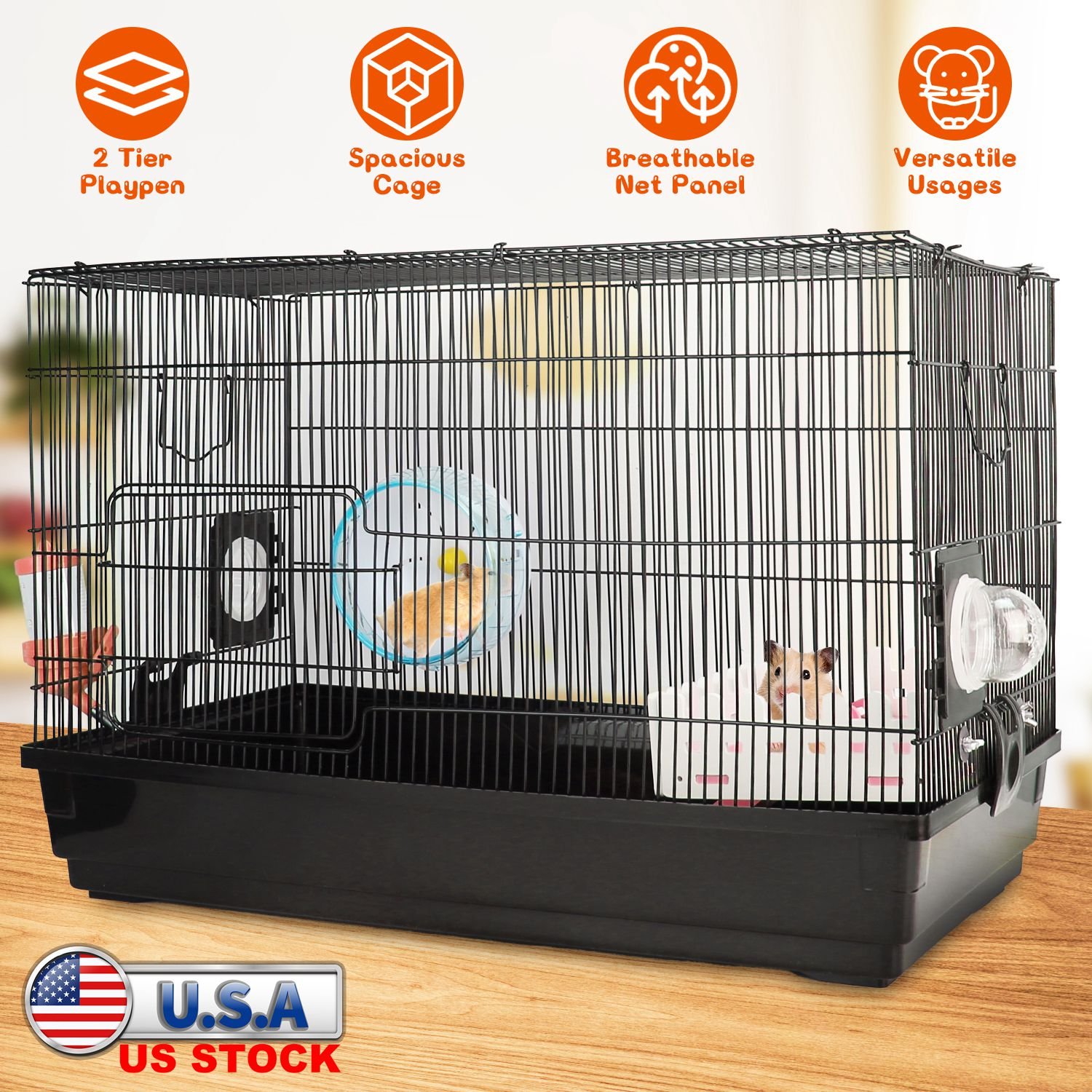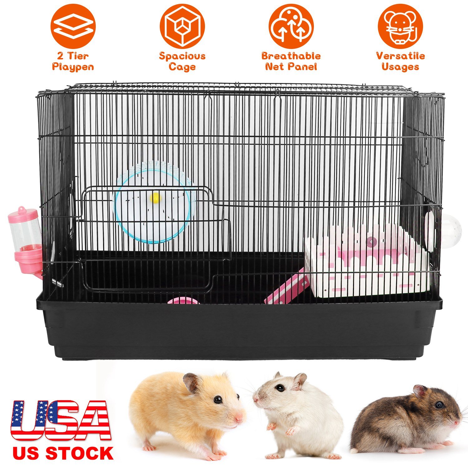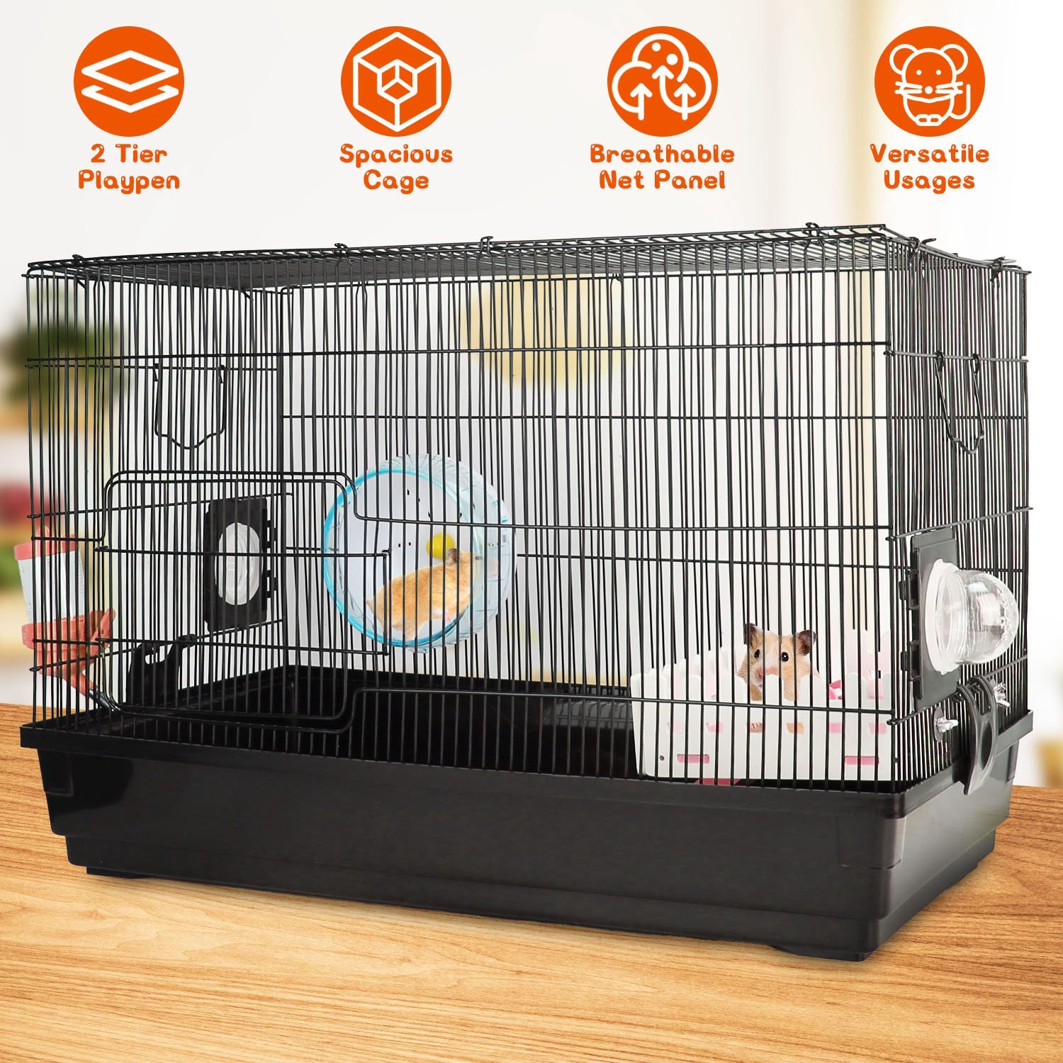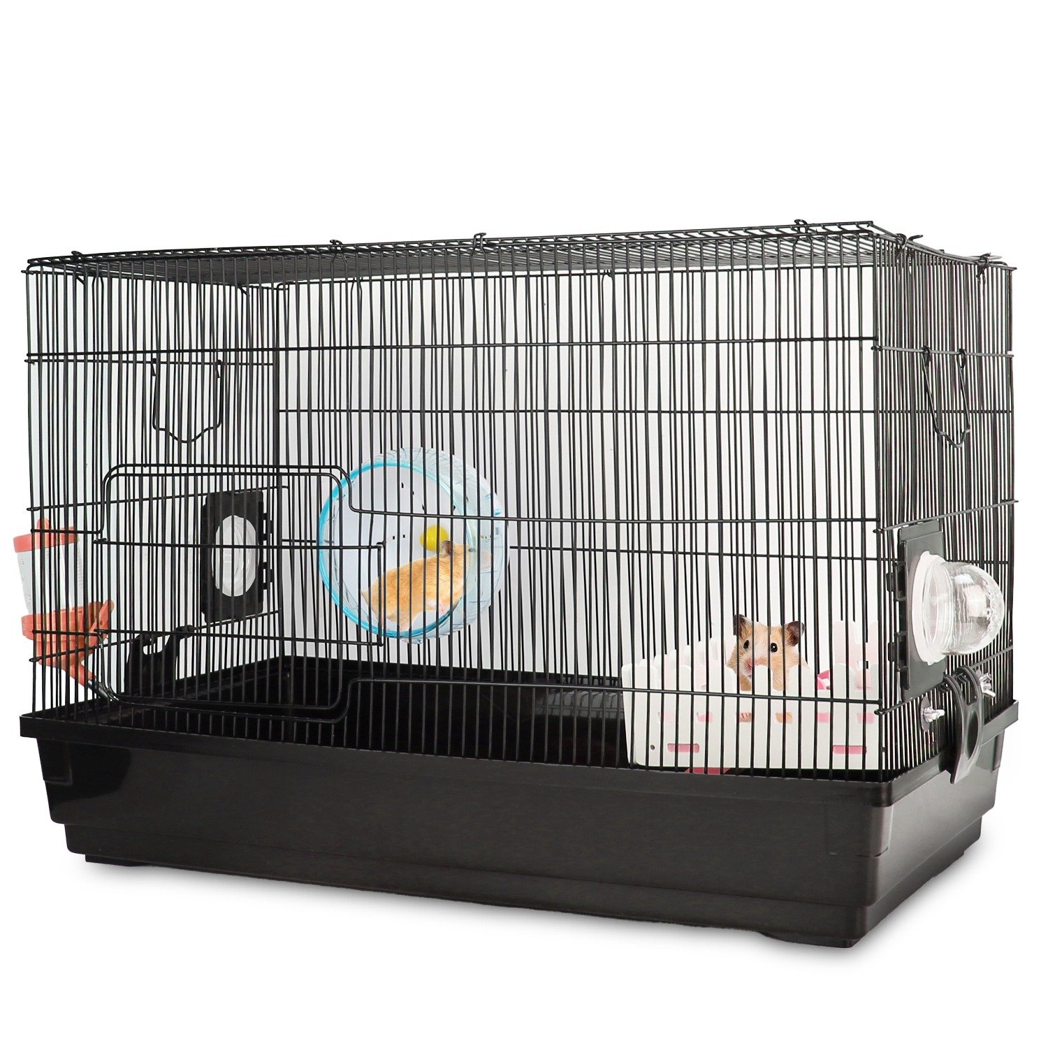 Want to create a comfortable home for you adorable hamster? Our two-tier cage designed with mesh panel is a good choice for you! Equipped with exercise running wheel, water bottle and food bowl to meet your lovely hamster's daily needs. Its loft-style second floor design makes it spacious enough so that it won't feel cramped. Suitable for small hamsters, baby hamsters, dwarf hamsters, miniature gerbils and other smaller animals.