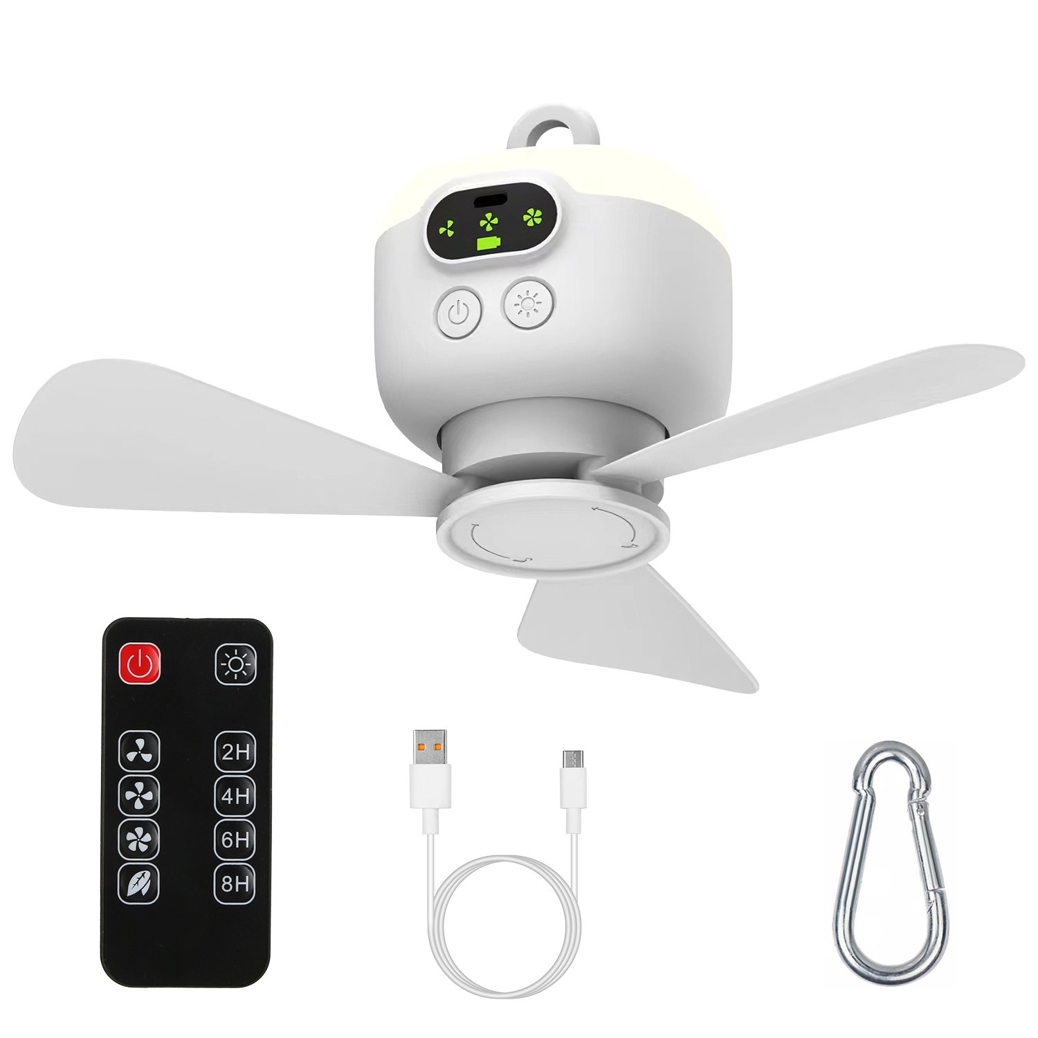 Enhance your outdoor experience with this versatile 2-in-1 camping fan and LED lantern. Perfect for camping trips, beach outings, or any outdoor adventure, this rechargeable camping fan provides both cooling airflow and bright illumination. With 4 wind speeds, 4 timer settings, low noise operation, and a digital display, it's designed for comfort and convenience. The detachable fan blades make it easy to store and carry, while the remote control adds to the user-friendly experience. Whether you're setting up camp or relaxing in your tent, this camping fan is your essential companion.