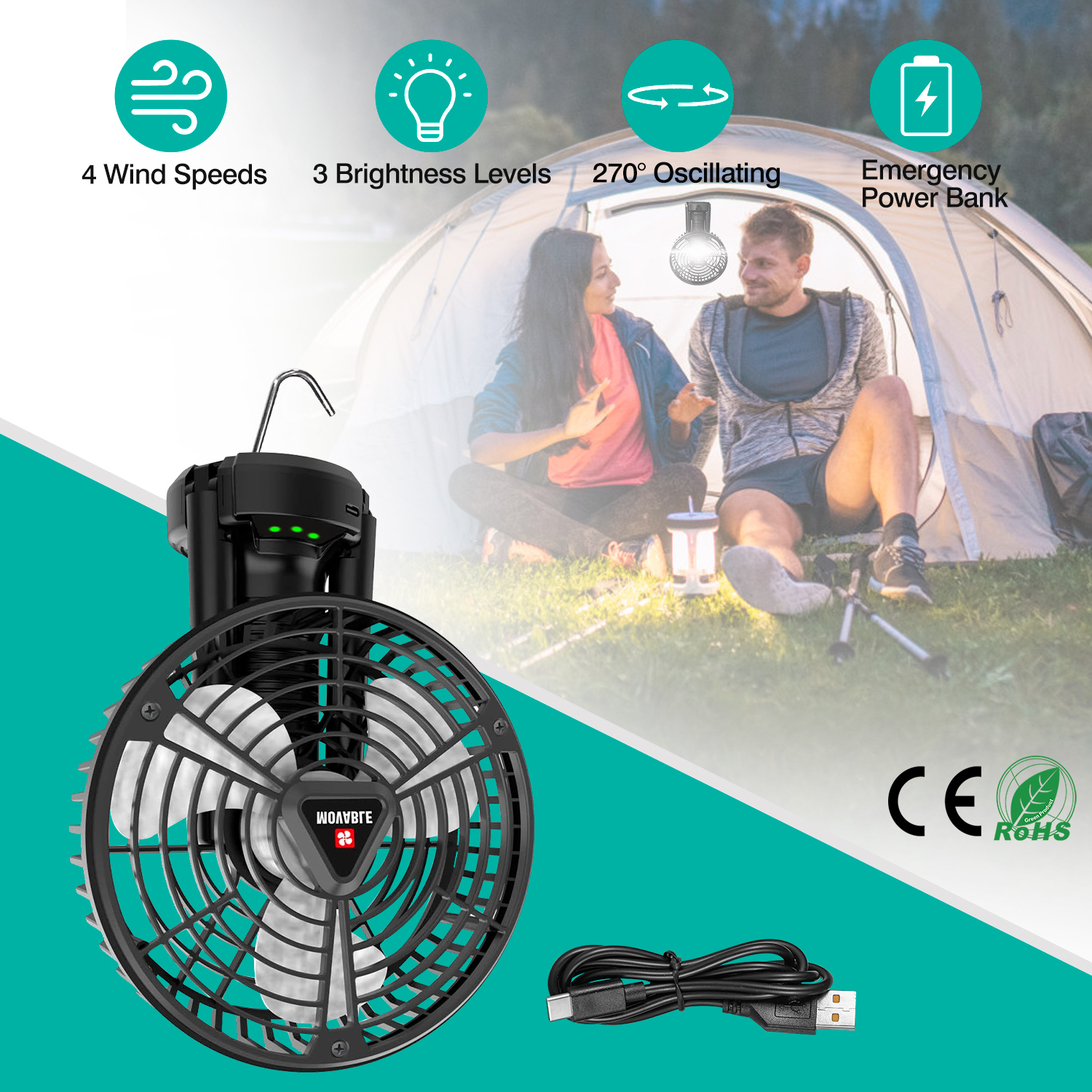 Do you want to enjoy a cool summer both outdoors and indoors? Our camping fan is a must-have companion for your trip. Equipped with 1 foldable tripod and 1 hanging hook on the bottom, our portable fan can be hung in the tent, put on the flat ground or table. Widely used for home and travel. The 4 wind speeds fully meets your different cooling needs. Our fan also features 270º and 180º adjustable angles, which can effectively disperse your surrounding heat and create a cool atmosphere for you. Featured with 12Pcs upgraded LED beads, our tent fan provides 3 brightness levels for portable lighting at night. With a Type-C charging cable, our camping fan can also work as an emergency power bank, making phone charging and self-charging more convenient and easier outdoors.