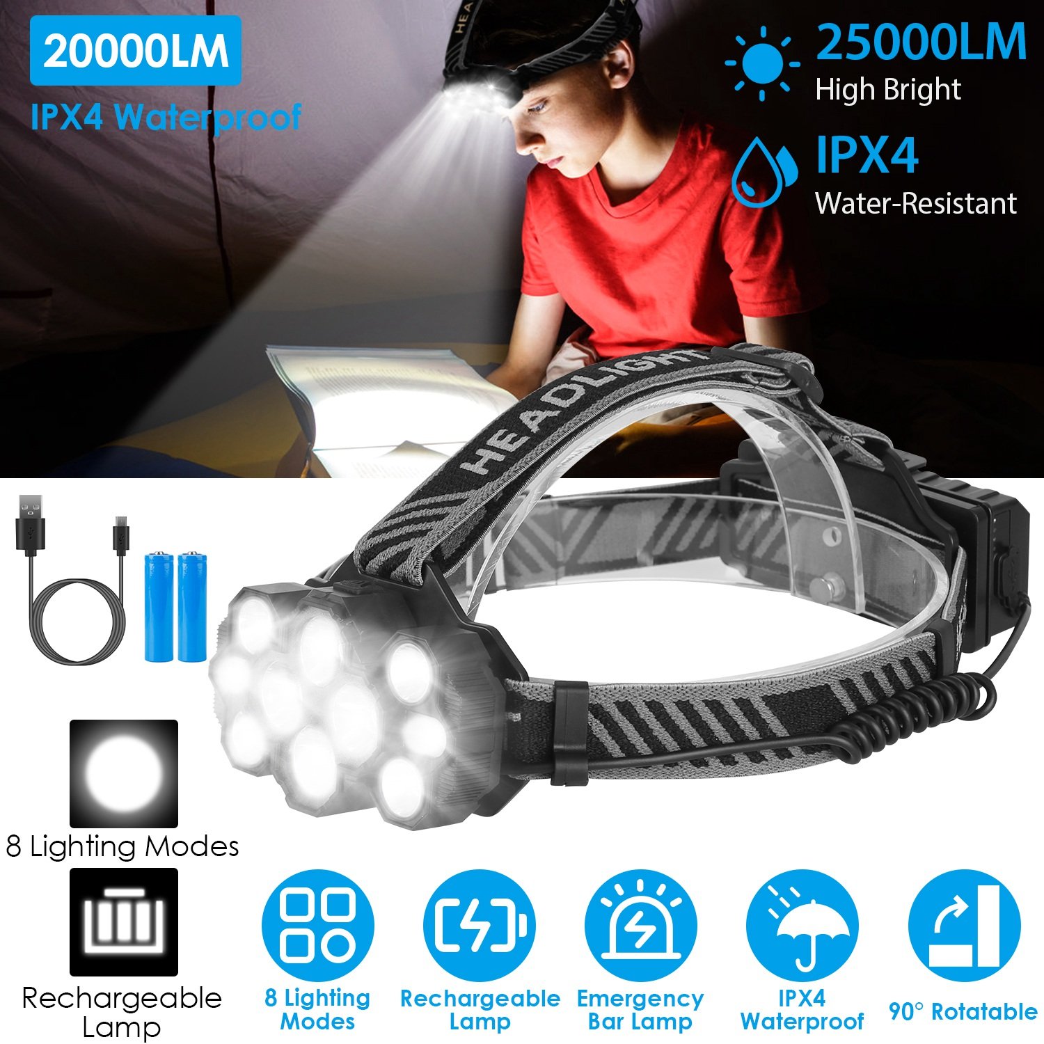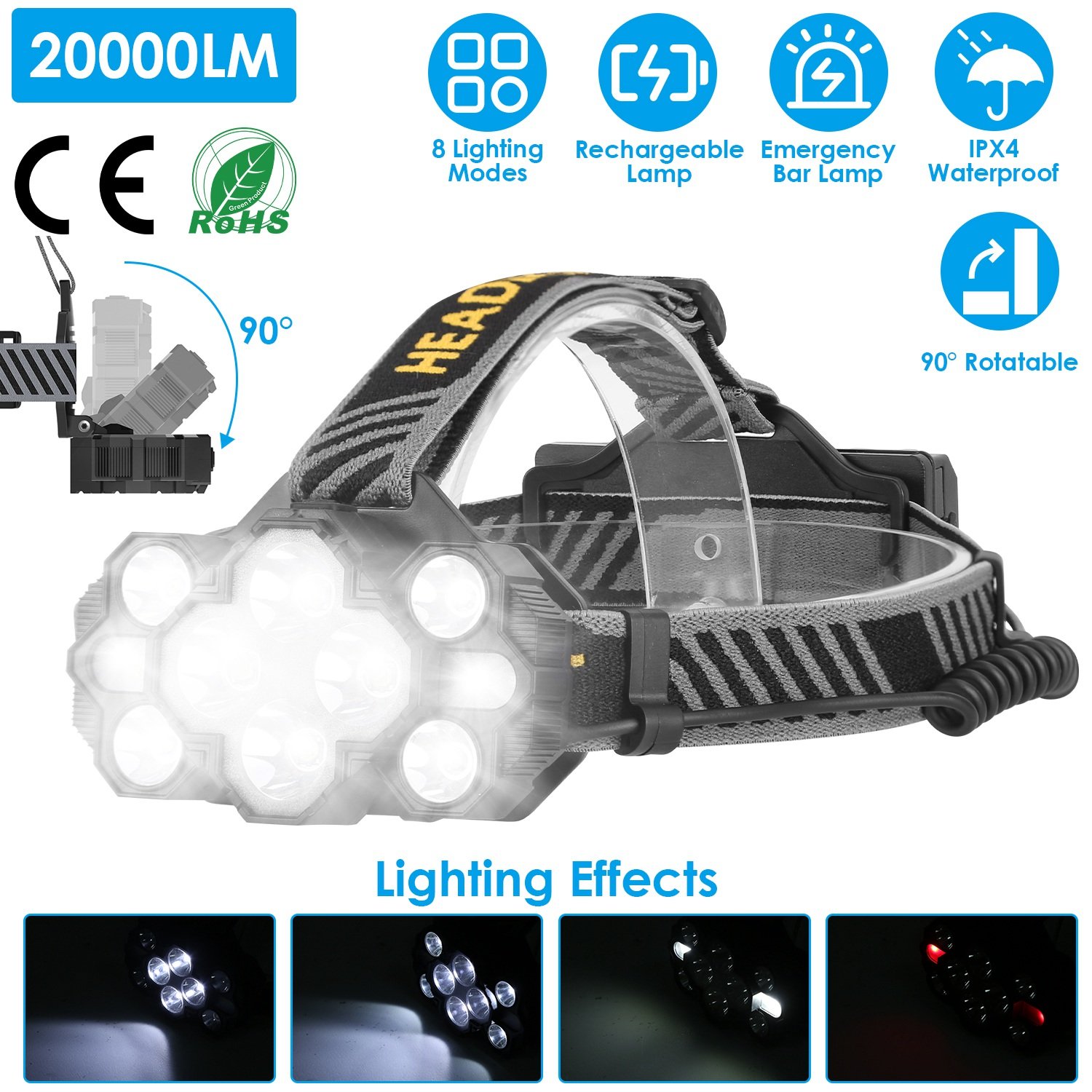 20000LM LED Headlamp 8 Lighting Modes Rechargeable Headlights IP44 Waterproof 90ºRotatable Headlights For Hiking Rescuing Camping