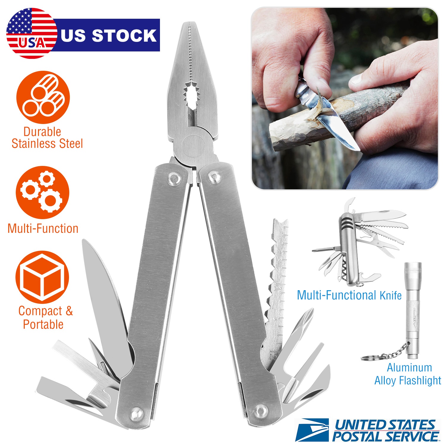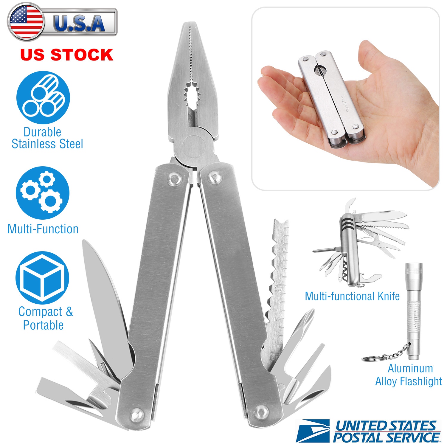 Made from heavy-duty stainless steel materials and adopting premium manufacture process, our multi-tool is sturdy, durable, anti-rust and sharp. The included knife combines with 11 kinds of different tools to realize multiple functions such as knife, can opener, bottle opener, wood saw, fish scaler, fishhook remover, small scissors, screwdriver, nail file, etc. and the included pliers integrates with pliers and cutter to realize functions such as needle nose pliers, gripper pliers, wire-cutting pliers, knife, bottle opener, Philips screwdriver, slotted screwdriver, nail file, fish scaler, fishhook remover etc. It also comes with an aluminum alloy flashlight to meet more needs. Additionally, they both come with a compact size for easy carry and storage.