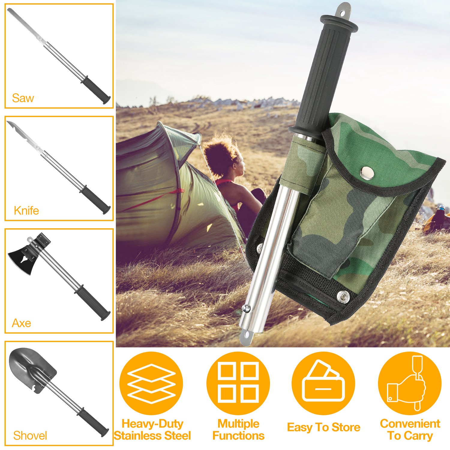 No matter you are camping, hiking, backpacking, climbing, fishing, adventuring or gardening, our multi multi-functional tools set which can be detached and reassembled to work as shovel, axe, knife, saw, bottle opener and nail puller will meet your needs. Additionally, the saw blade and knife blade can be organized into the handle and it extra comes with a custom-made storage bag which can be fixed on your belt for an easy carry to store the handle, axe head and shovel head in order.