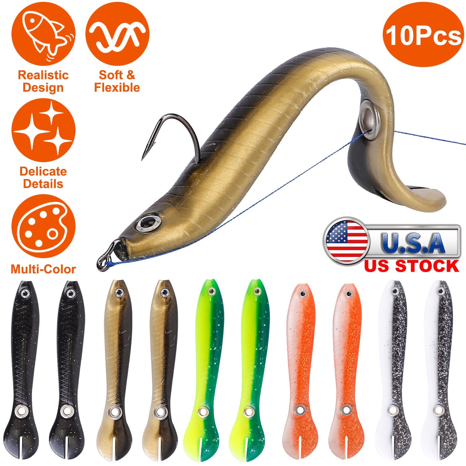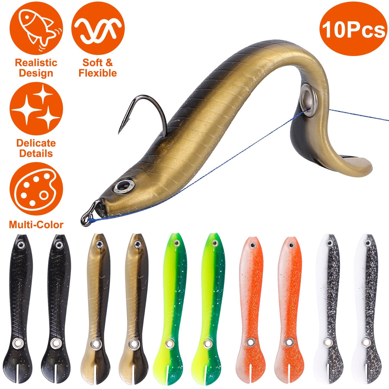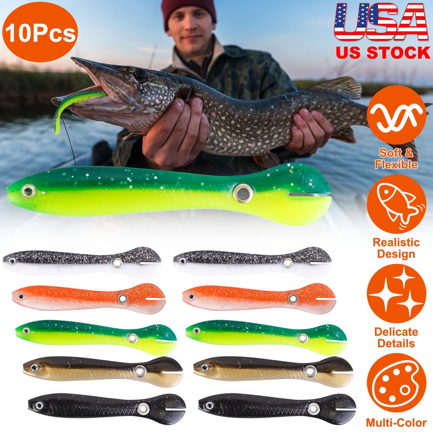 Come with 10Pcs Soft Fishing Lures which are super soft and flexible and able to swim like a real fish with paddle tail, can make your fishing more easily. The delicate and realistic details can deceive the target fish simply. Perfect for seawater and freshwater to bait bass, trout, panfish and more.