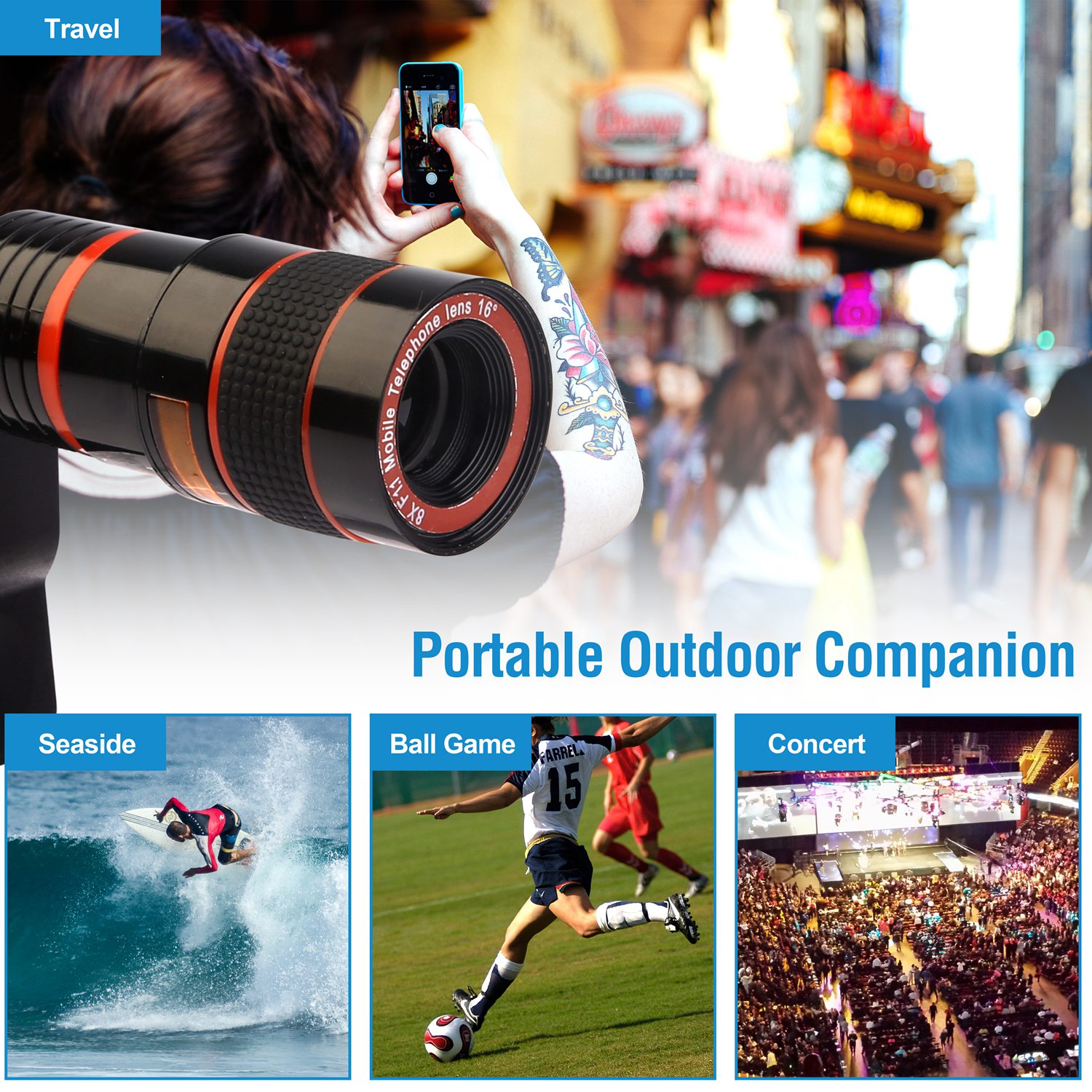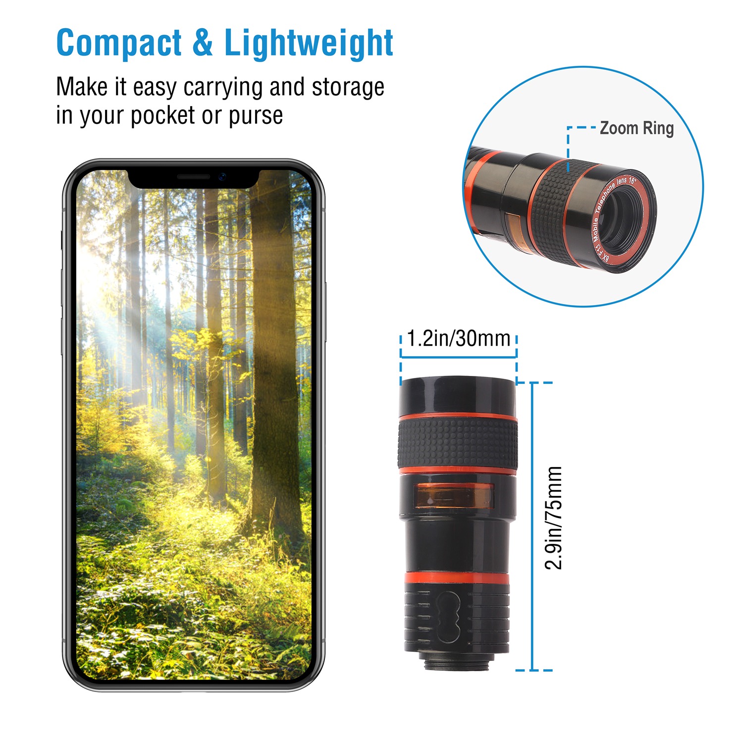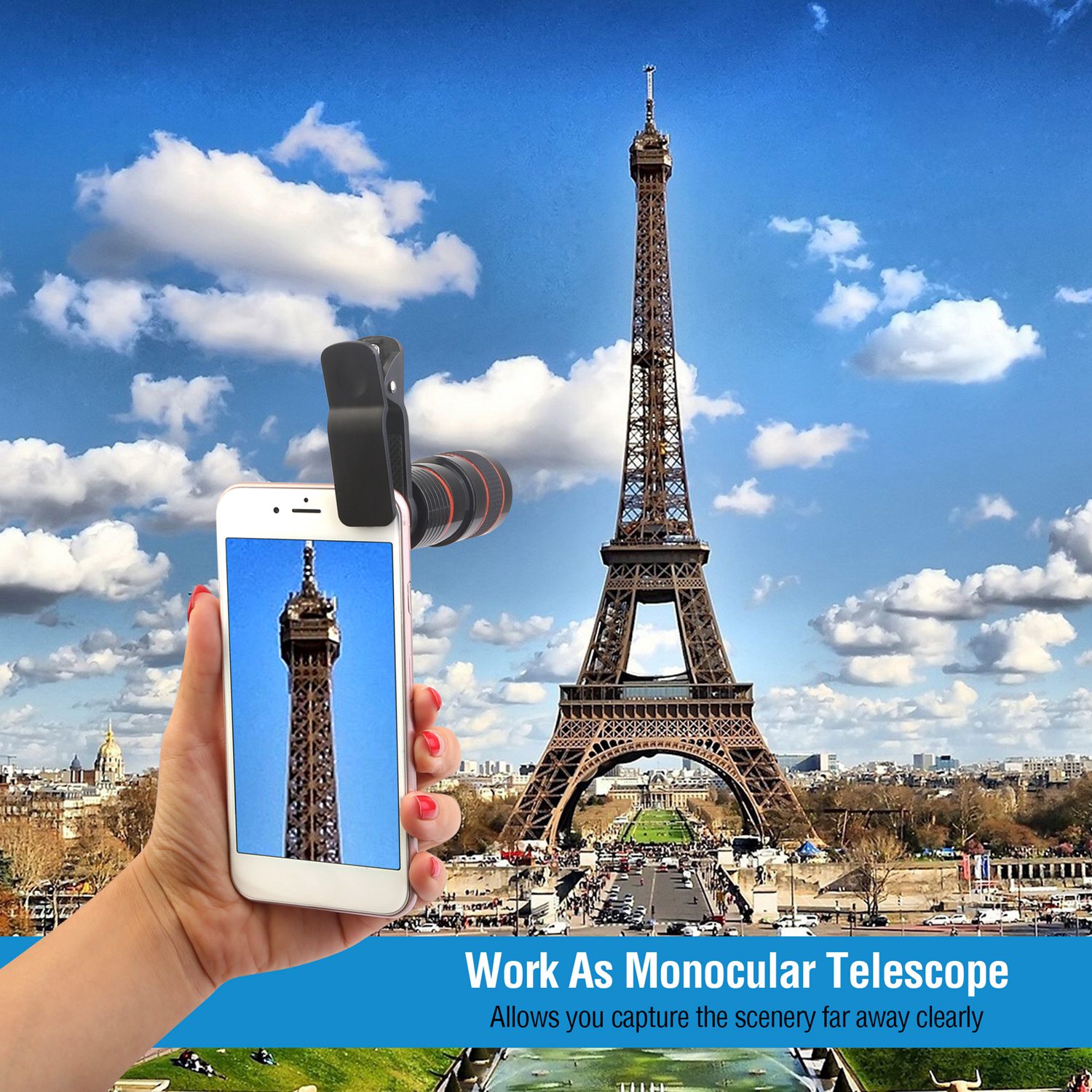 Our 8X universal phone camera lens is a telephoto lens which is specially designed to help your phone to enlarge the photograph distance. It makes you view and take clear picture within the range up to 246m/807ft without compromising image quality. Designed with premium optic lenses, which allows you capture shots with amazing clarity and detail without vignetting and blurring. Universal lens clip with detachable design fits all kinds of smartphones, including for iPhone X/ XS/ Max/ XR, for Samsung Galaxy S10/ S9+, etc. Moreover, its lightweight and portable design makes it a pocket telescope, ideal for watching match, ball game, concert, travel, sightseeing, animal observation, etc.